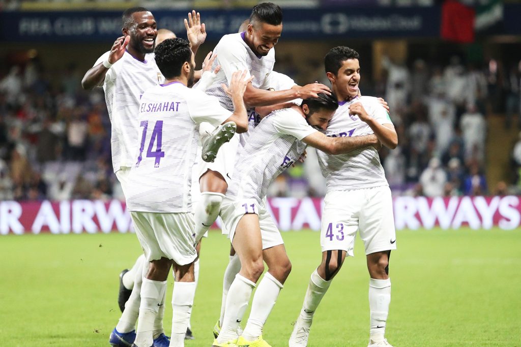 Soccer Football – Club World Cup – Quarter Final – Esperance Sportive de Tunis v Al Ain – Hazza bin Zayed Stadium, Al Ain, United Arab Emirates – December 15, 2018 Al-Ain’s Bandar Al Ahbabi celebrates scoring their third goal with Rayan Yaslem and team mates REUTERS/Suhaib Salem