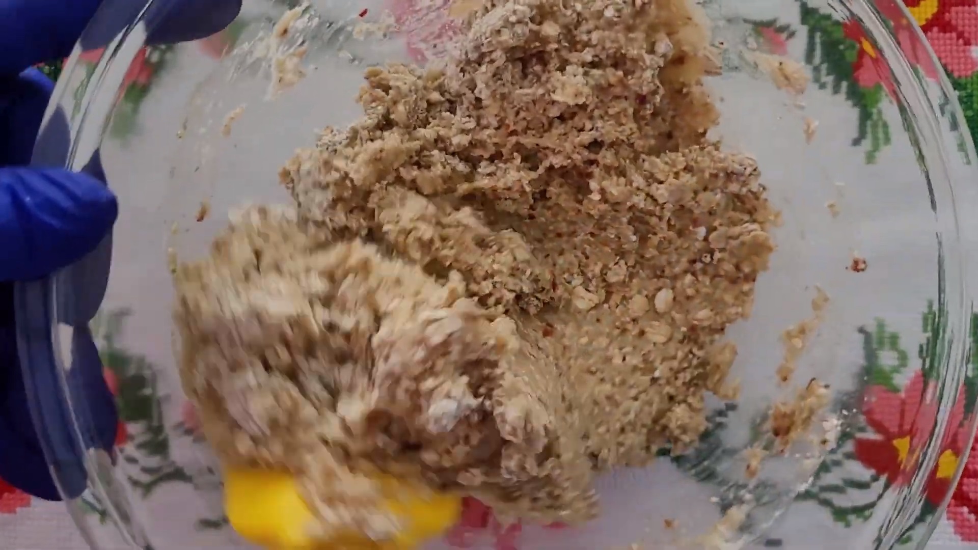 - Acrescente o restante da aveia em flocos e amasse os ingredientes com as mãos até formar uma massa homogênea.