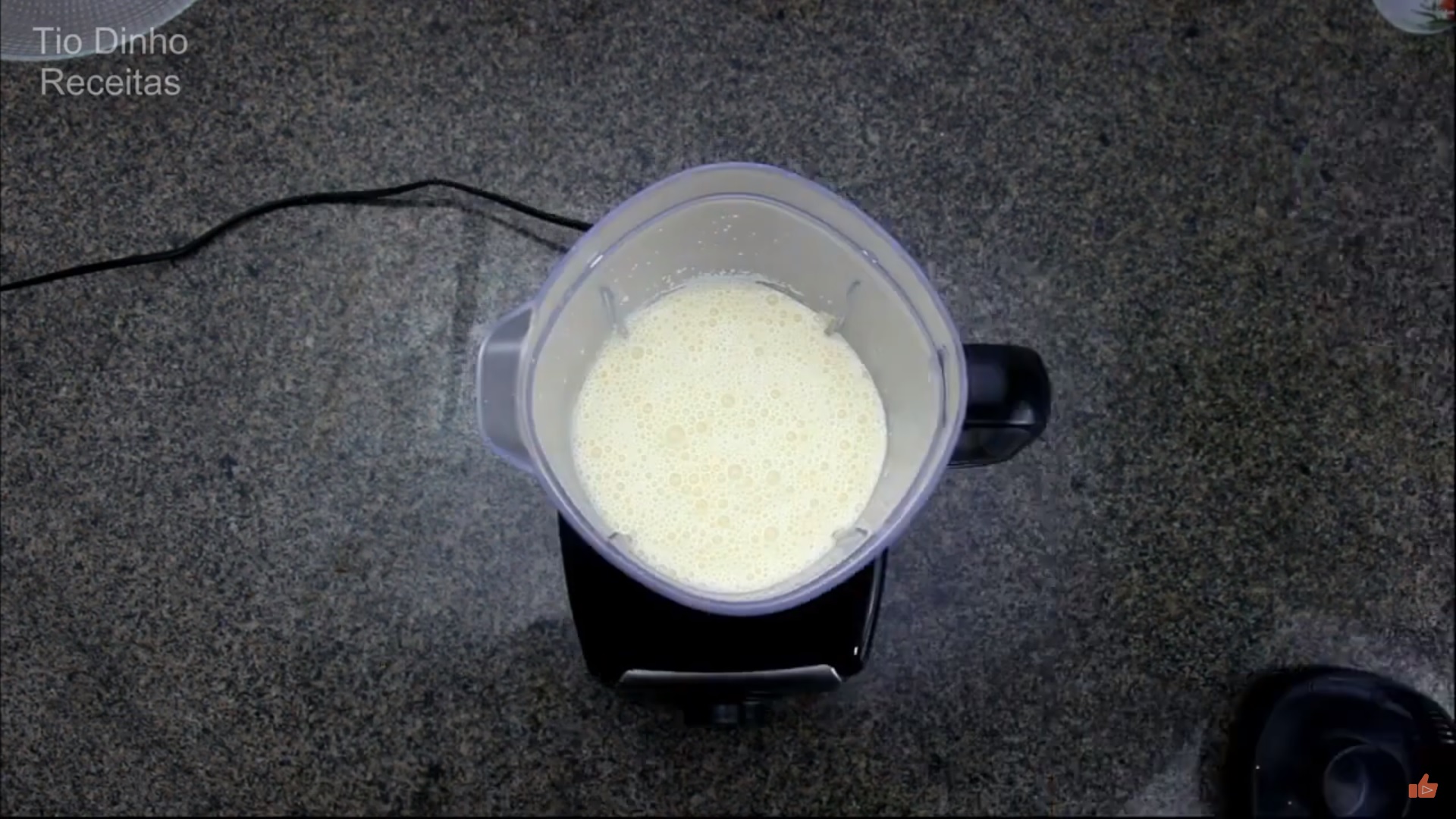 - Adicione em um liquidificador os ovos, o açúcar, o leite, o óleo, o flocão e bata por 3 minutos.