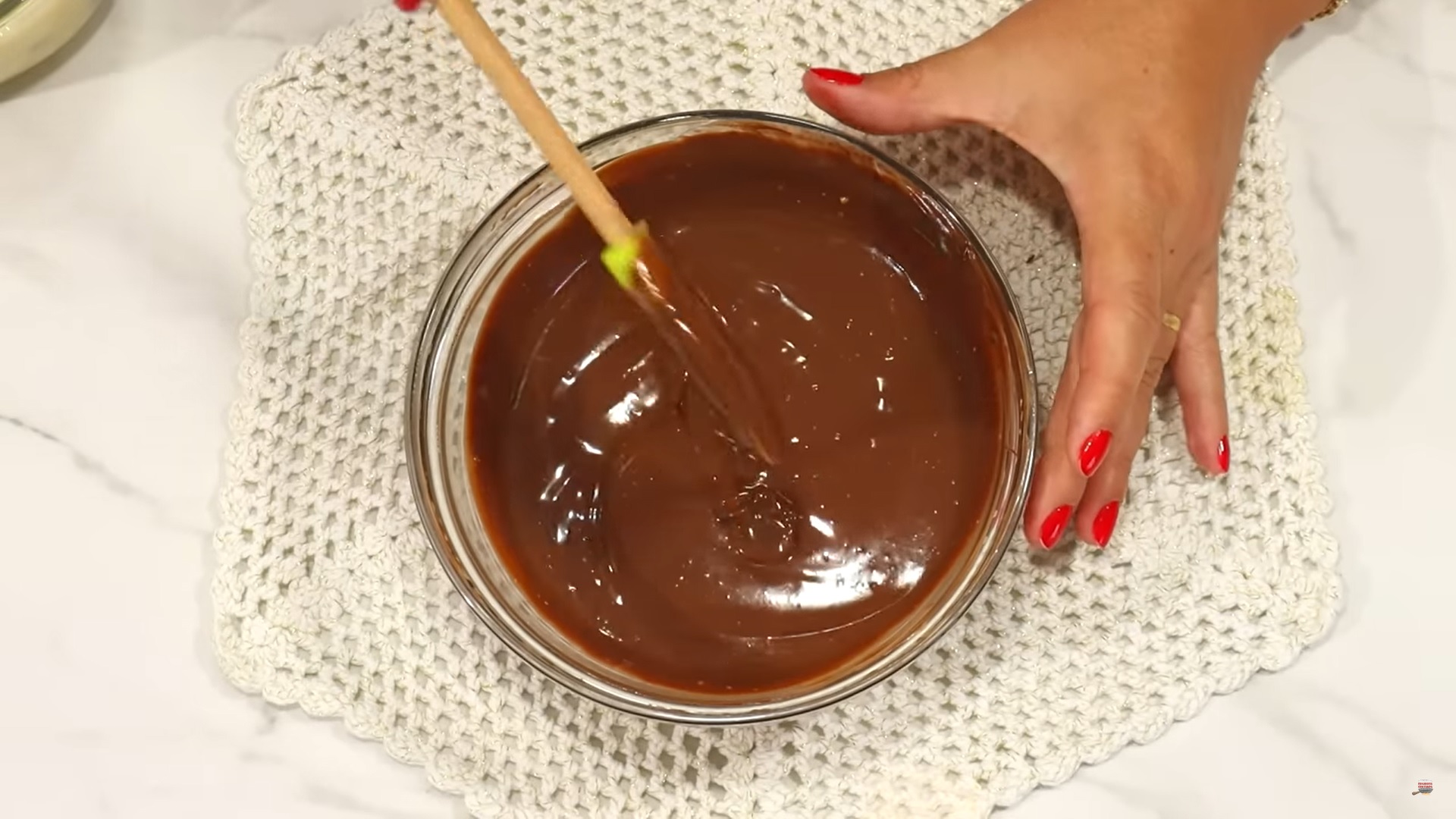 - Para fazer a ganache derreta o chocolate em banho-maria ou no micro-ondas de 30 em 30 segundos e misture com 1 creme de leite até homogeneizar.