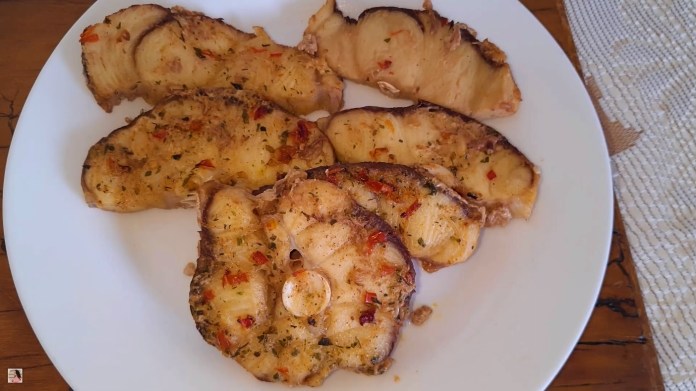 - Misture bem, espalhe os temperos em ambos os lados das postas e reserve por 20 minutos para absorverem bem.