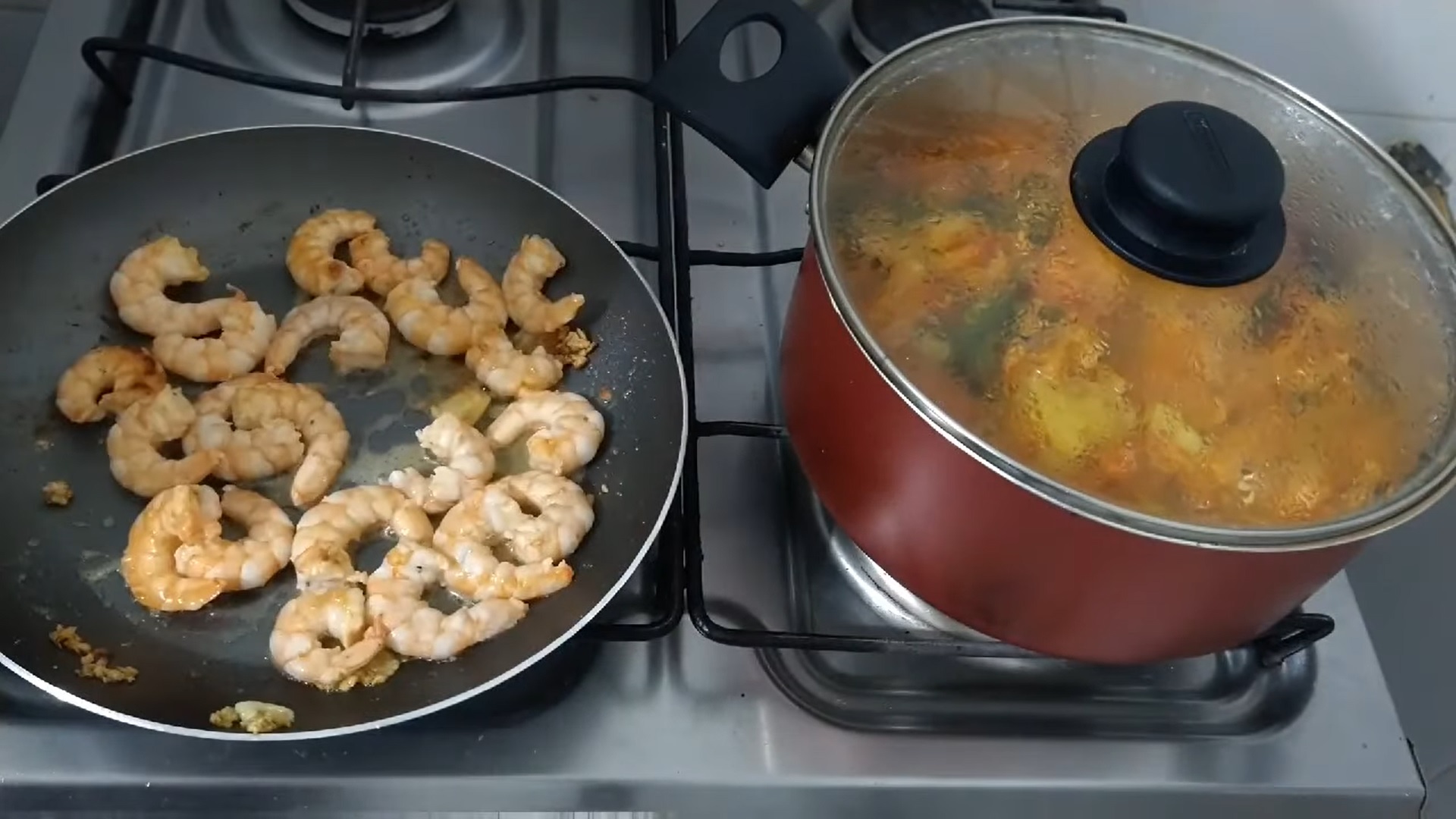 - Tampe a panela e cozinhe os ingredientes até as batatas ficarem macias. Pré-aqueça uma frigideira com azeite a gosto e frite o alho picado até ficar levemente dourados. Coloque os filés de camarão com um pouco de suco de limão, mexa constantemente até que fiquem um pouco dourados e reserve.