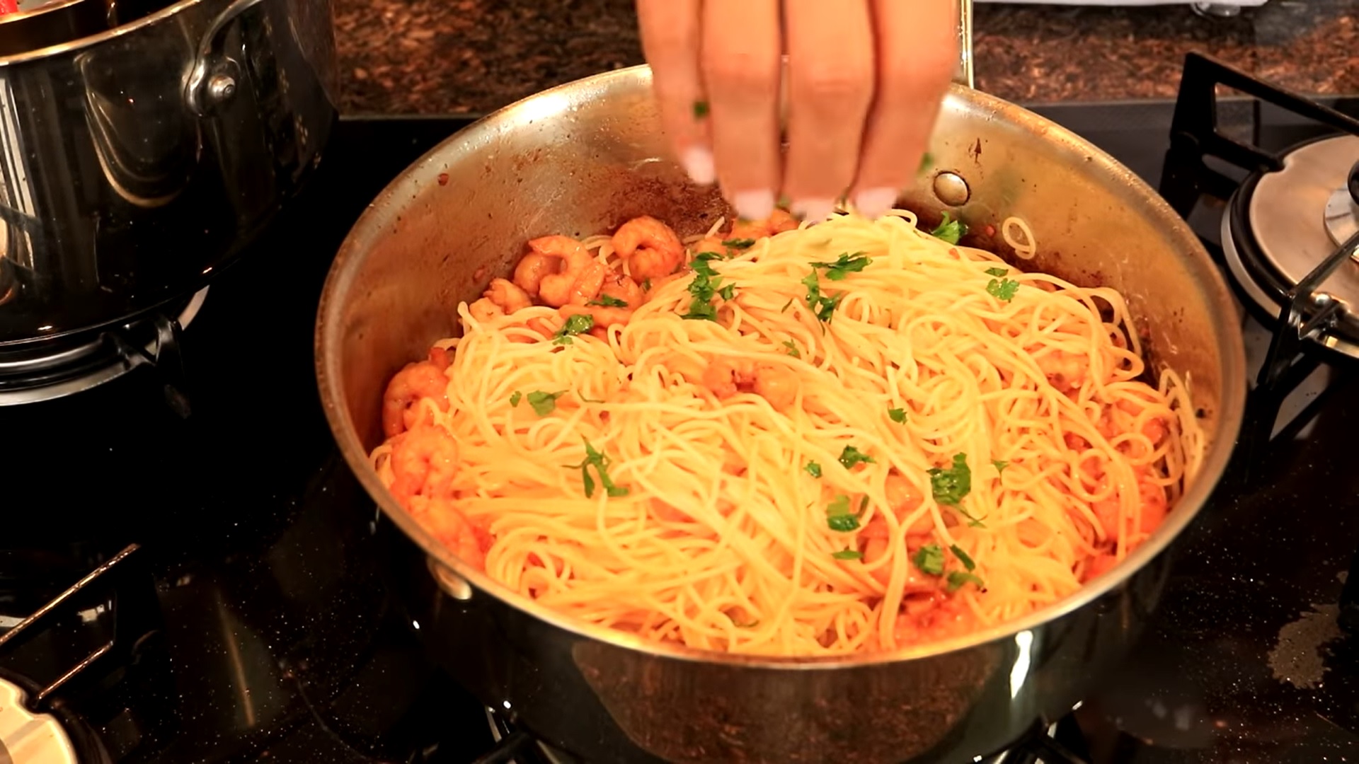 - Retire o espaguete com camarão ao alho e óleo do fogo, salpique salsinha fresca picada e a receita está pronta para ser servida em pratos de sua preferência.