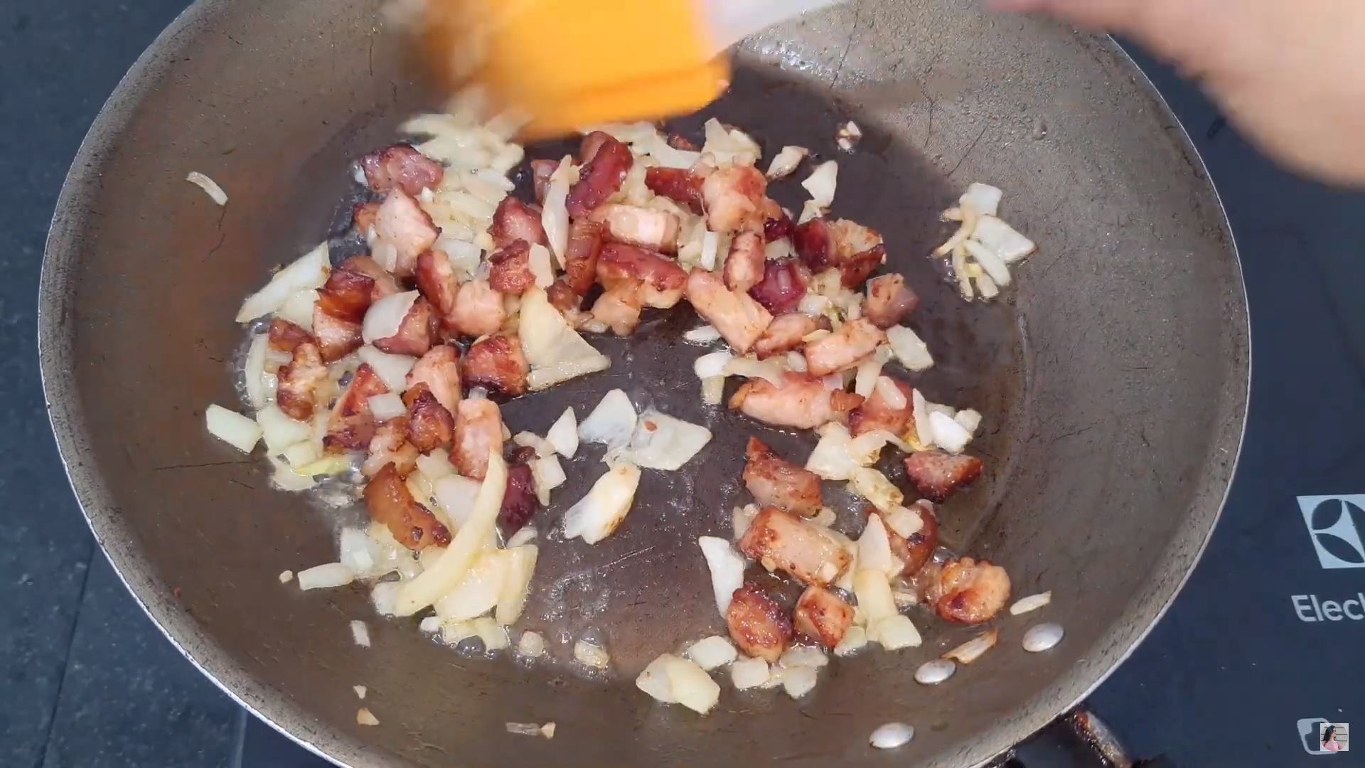 - Em uma frigideira no fogo derreta a manteiga ou margarina, acrescente o bacon picado e frite até dourar sem parar de mexer.