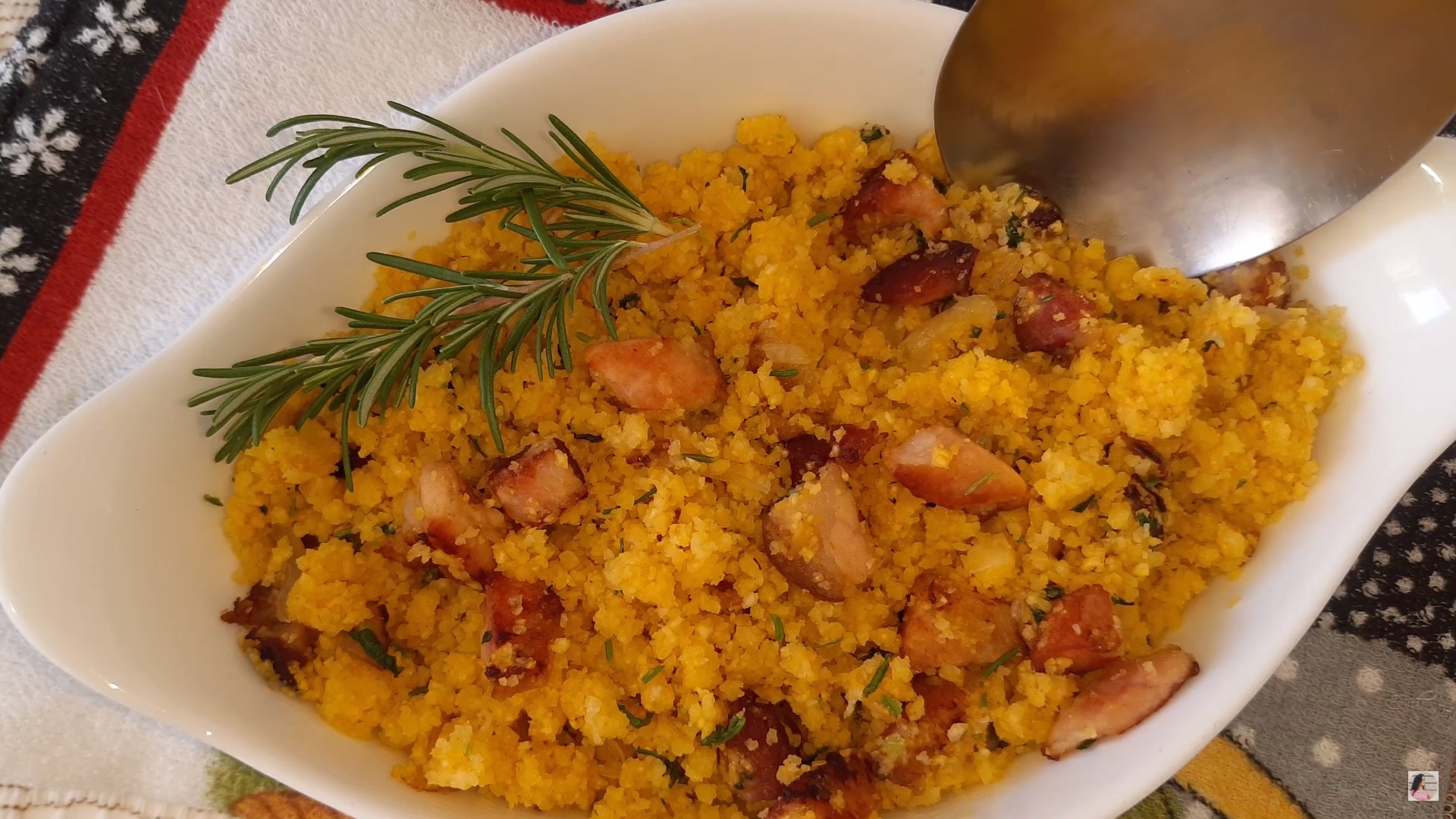 - Refogue por mais 2 minutos mexendo constantemente, desligue o fogo e a farofa de flocão de milho com bacon está pronta.