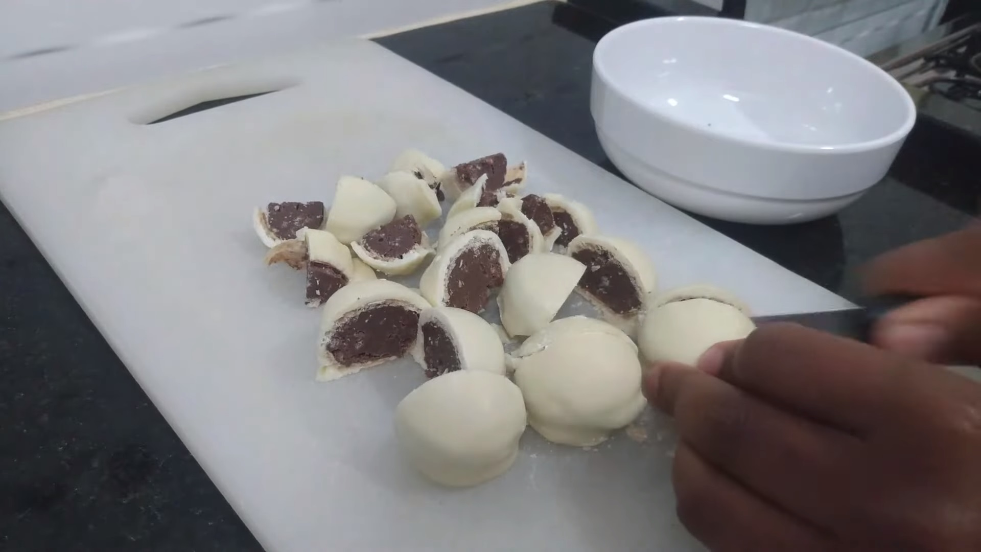 - Pique alguns bombons em 4 partes e outros pela metade para a decoração da sobremesa e reserve-os.
