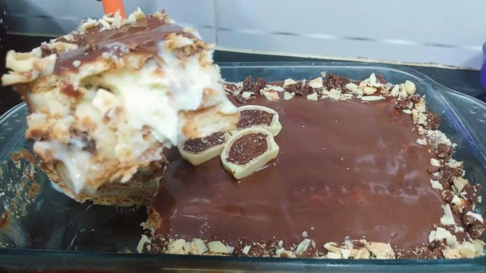 - Faça outra camada com biscoitos e novamente com o creme. Acrescente alguns bombons que foram picados em pedaços menores. Repita o processo e finalize com uma de creme.