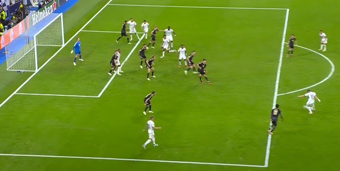 Entretanto, no último lance da partida, Valverde arriscou um chute de longa distância que desviou em vários jogadores na área e sobrou para Bellingham, mais uma vez o destaque, empurrar a bola para o fundo da rede.
