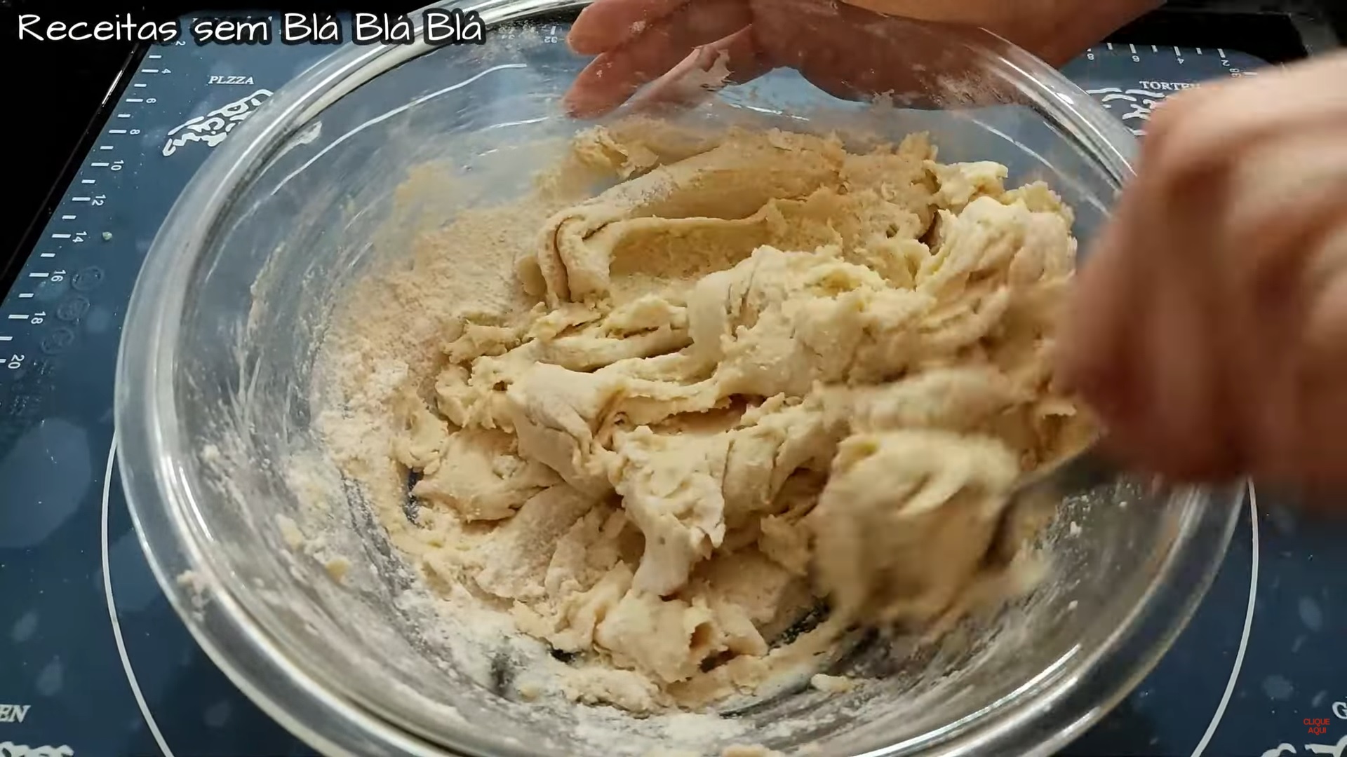 - Misture os ingredientes com as mãos até a massa ficar homogênea. Cubra com plástico filme e deixe na geladeira por 10 minutos.