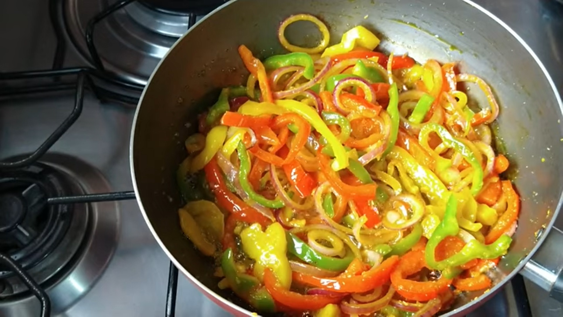 - Corte os pimentões em tiras e reserve. Pré-aqueça uma frigideira com azeite a gosto, acrescente os dentes de alho amassados e doure. Adicione o colorau e misture, em seguida acrescente os pimentões em tiras, a cebola cortada em rodela e refogue até murcharem, mexendo bem.