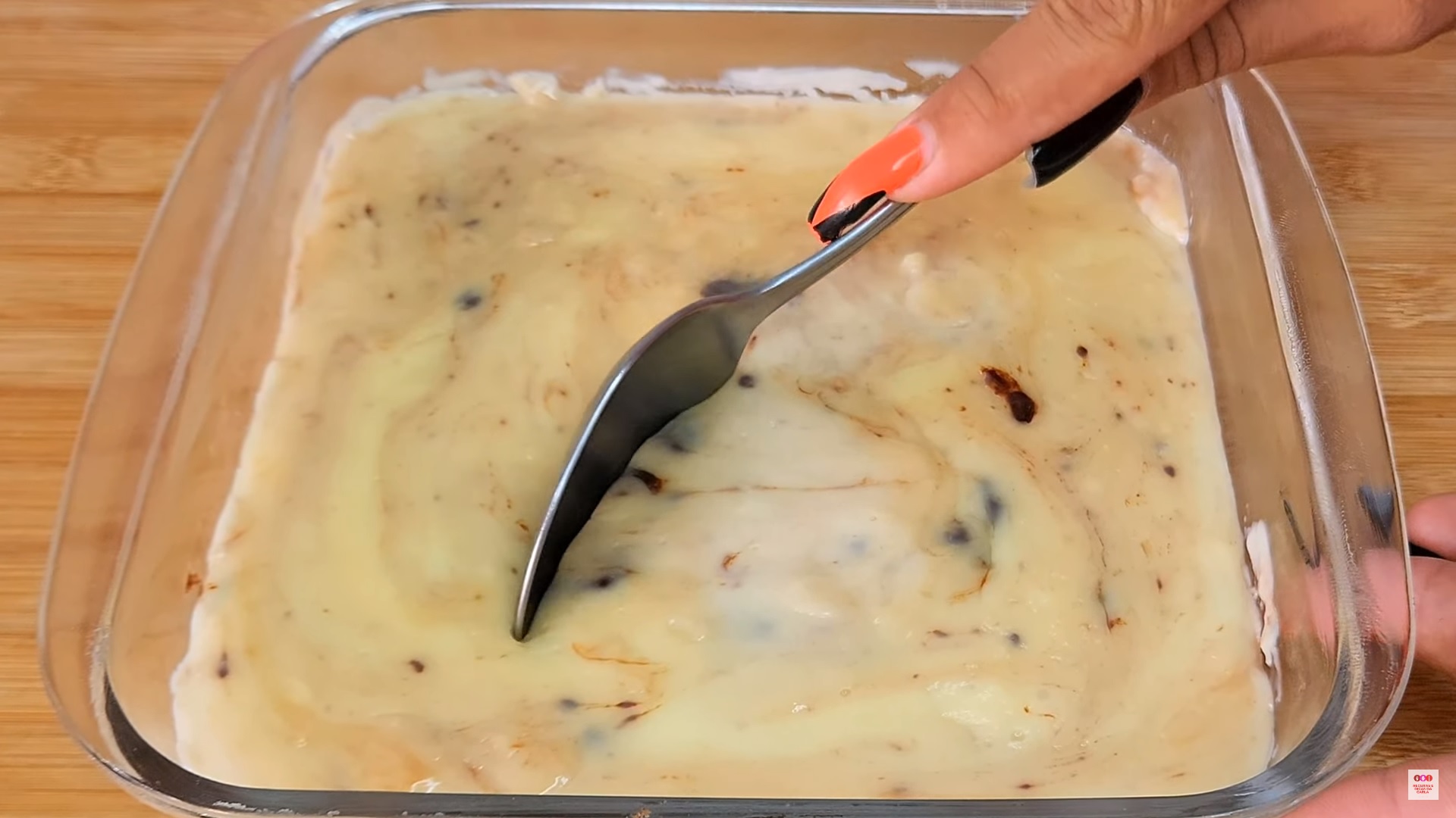 - Transfira o creme para um refratário ainda quente, acrescente o chocolate meio amargo picado e misture levemente para o chocolate derreter.