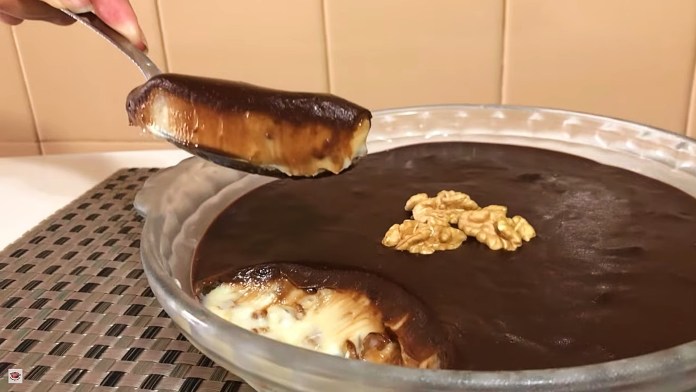 - Derrame a ganache de chocolate por cima do creme e decore com nozes a gosto.