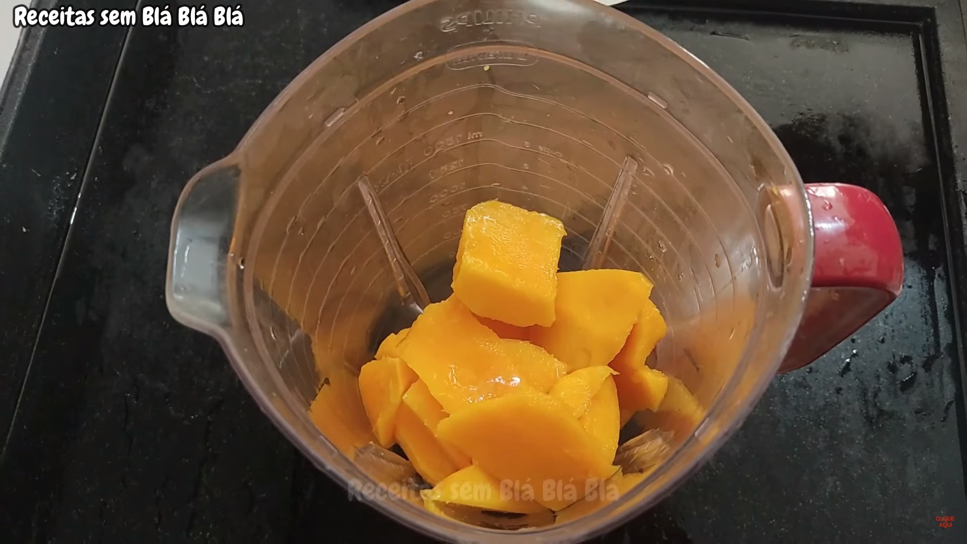 - Descasque a manga, corte-a em pedaços e coloque em um liquidificador.