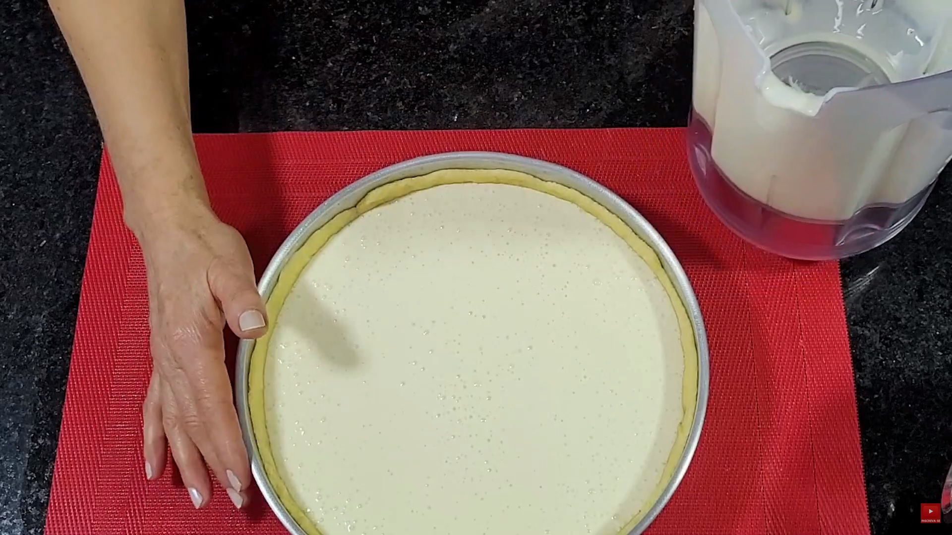 - Despeje a mistura líquida por cima da massa e leve a torta para assar por cerca de uma hora em forno pré-aquecido a 180º₢.